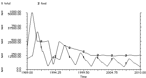 This graph shows the squirrel population and food level from 1989 to 2010.